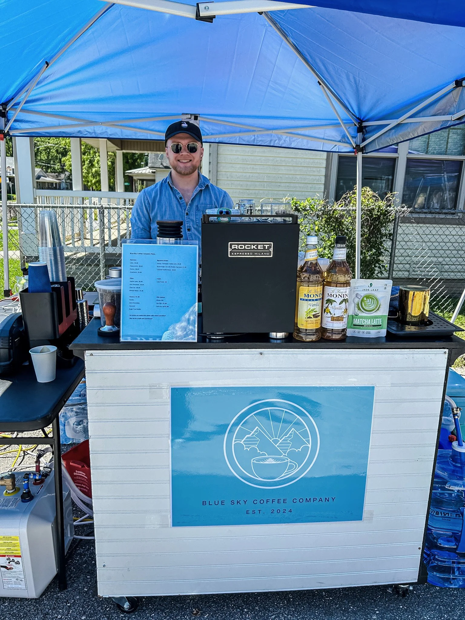 Hi everyone, my name is Brayden and I am the owner of Blue Sky Coffee Company, a mobile coffee cart located in the Springfield Mo area. We serve a variety of iced and hot espresso drinks and strive in maintaining the highest quality product. In the spring of 2024 I decided to sell my motorcycle and pursue my life long dream of owning my own coffee shop. Instead of opening a brick and mortar, I decided to start a coffee cart. The advantages of a coffee cart as opposed to a truck or trailer is it delivers a more intimate coffee experience. People often enjoy watching the process of making their drinks and speaking to their barista face to face instead of through a small window. A cart can also be indoors, which avoids people having to stand in line during unfavorable weather. I started the cart for my love of coffee and people. I also strive to show people that with a good quality coffee, the amount of sugar and syrups a lot of local chains put in their drinks is unnecessary. When you drink Blue Sky Coffee, the natural sweetness of the coffee shines through. I have been studying and mastering the art of brewing coffee and espresso since a young age and take the extra time to ensure that every drink is of the utmost quality. If your event needs some energy, Brighten your event with Blue Sky Coffee Company.